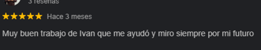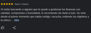 "Siempre me había interesado el tema de las finanzas y sabía que era importante, pero nunca supe por dónde empezar. Con Iván hasta ahora el trato ha sido muy cercano y profesional. Recomiendo su servicio a cualquier persona que quiera estar bien organizada"
