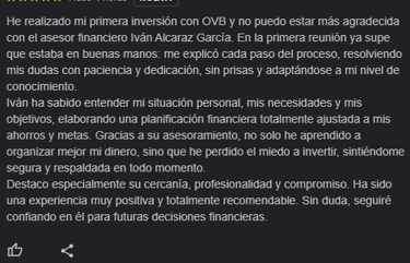 "A mis 50 años me has ayudado a crear un plan de ahorro seguro y con visión a largo plazo, cosa que nunca me había planteado y que ahora entiendo la importancia. Lo que más valoro es la cercanía y la tranquilidad que me transmites."